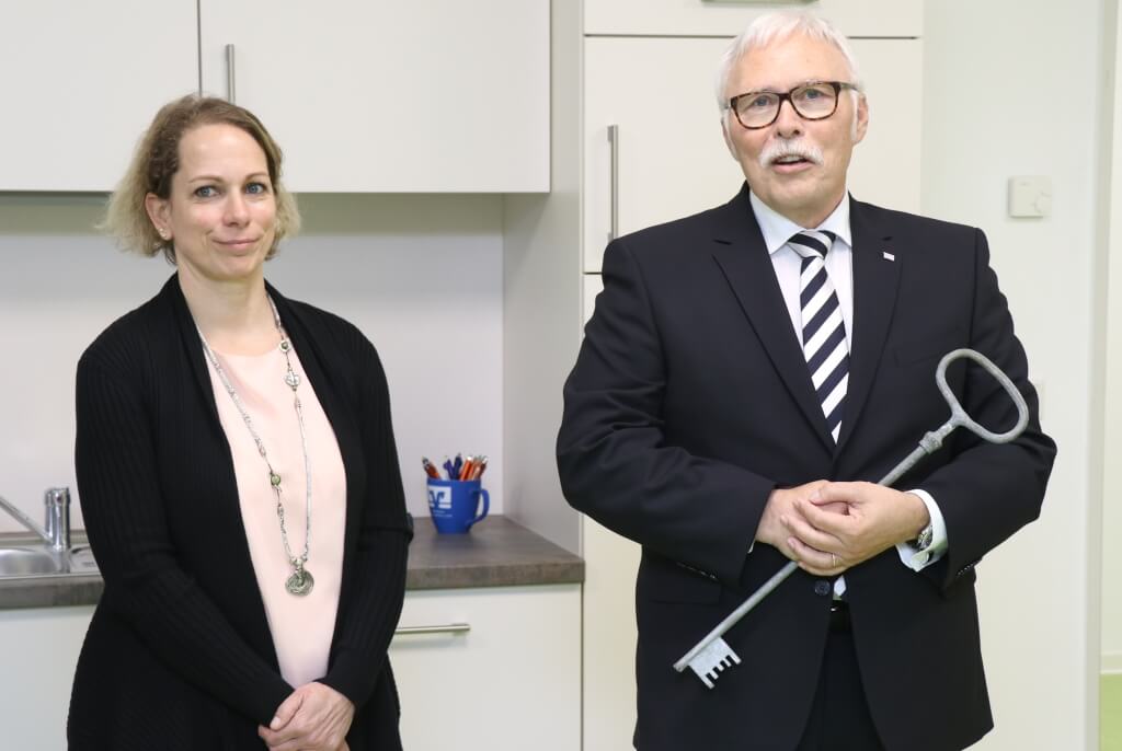 SOLINGEN (bgl) – Nach rund einjähriger Bauzeit ist die Volksbank-Kita an der Hansastraße bezugsfertig (wir berichteten hier, hier und hier). Am Freitag fand in den Räumen des neuen Kindergartens, der sich in unmittelbarer Nähe zum Galileum befindet, eine symbolische Schlüsselübergabe statt. Lutz Uwe Magney, Vorstand der Volksbank im Bergischen Land, überreichte als Bauherr und Besitzer die brandneue Kita an Claudia Hagemann, Vorstandsvorsitzende des Trägervereins der Pinocchio-Einrichtungen in Solingen. Dieser hat das Gebäude für zunächst 20 Jahre angemietet, das in Kürze als „Kita Pinocchio III“ den Betrieb aufnehmen wird. Die Volksbank wird die Patenschaft der Kita übernehmen.