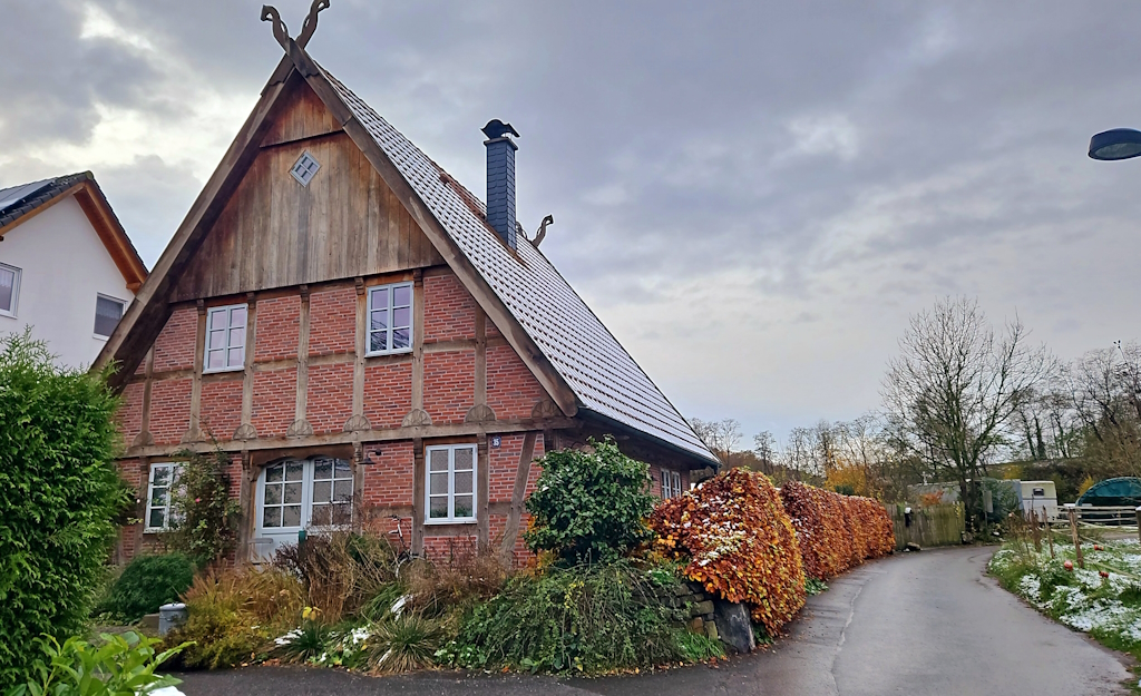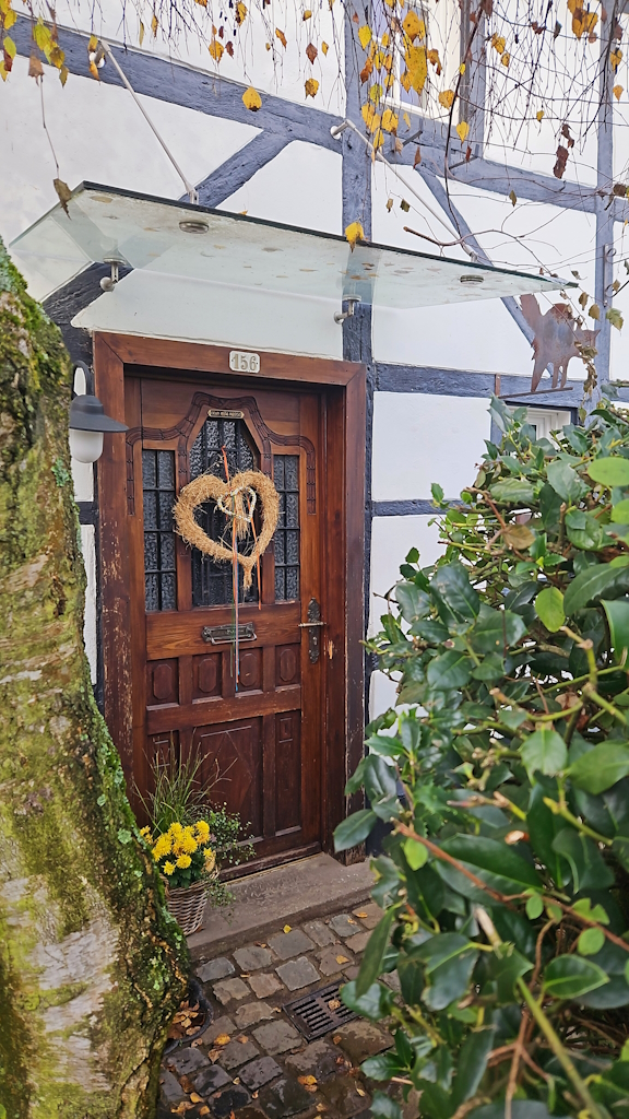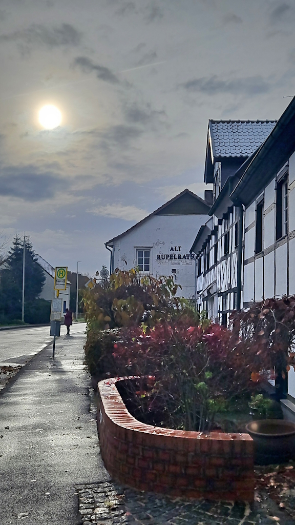 Der Weg führt durch eine Unterführung und vorbei am malerischen Romantik-Gästehaus. Ich setze meine Schritte in Richtung der Ortschaften Holzkamp und Rupelrath. Besonders heute, bei dem sanften Licht, das der Schneefall zaubert, scheint alles noch ein Stück heimeliger. Die alten Fachwerkhäuser und Schieferfassaden reihen sich entlang des Weges und lassen die Dorfgemeinschaft im Adventsglanz erstrahlen. Rupelrath selbst blickt auf eine lange Geschichte zurück, die bis ins Mittelalter reicht. Es gibt einige historische Hofanlagen, wie die alte Gosse und den Müllerhof, die von der landwirtschaftlichen Tradition der Region zeugen. Umgeben von sanften Hügeln, Wiesen und Wäldern schlängelt sich die Wupper durch diese typisch bergische Landschaft.