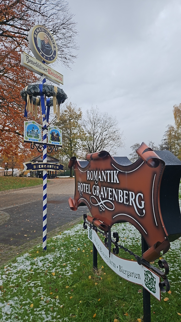 Die Tour beginnt auf dem Parkplatz hinter dem Romantikhotel der Familie Lohmann am Gravenberg, unweit des Wildgeheges. Der erste Anblick ist eine winterliche Idylle: Schneefall verleiht der Landschaft eine fast magische Atmosphäre, und die hungrigen Tiere am Zaun warten auf Futter. Für den Rückweg besorge ich an der Rezeption ein Paket Winterkraftfutter (Kosten: 1,50 €), das die Tiere auf der letzten Etappe der Wanderung sicher zu schätzen wissen.