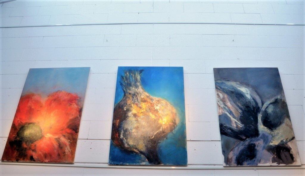 Daniela Hoppenkamps malt schon seit vielen Jahren und hat bereits an diversen Kunstwettbewerben teilgenommen. Für ihre Diplomarbeit hat sie den Zyklus der Mohnkapsel gewählt. Auf drei Ölgemälden in 90 x 140 cm zeigt sie die Entwicklung: Mohnblüte, Mohnkapsel, Vergänglichkeit der Mohnkapsel. „Ich habe vorher ausschließlich in Acryl gearbeitet. Meine derzeitige Phase ist aber das Malen in Öl.“ Auch ein abstraktes Werk mit dem Thema „Linien“ findet man in ihrer Sammlung. Die Künstlerin arbeitet gerne konzeptionell, stellt sich selbst Themen, die sie dann mit Skizzen und Vorarbeiten entwickelt. „Ich bevorzuge kräftige Farben, auch Komplementär-Kontraste.“ Titel möchte die Malerin ihren Gemälden nicht geben. „Dann ist der Betrachter gebunden“, erläutert sie ihre Entscheidung. „Er soll selbst spüren, was er in dem Bild sieht. Es ist die ganz persönliche Interpretation.“