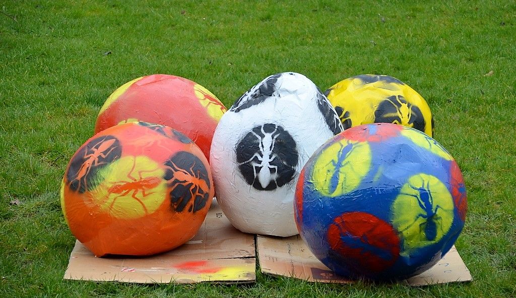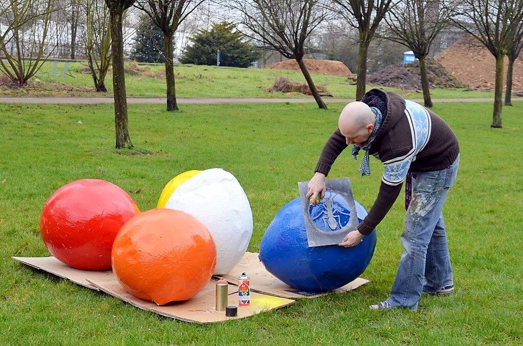 Auch Thomas Willis von Willis Art hat sich mit dem Osterthema und der Vergänglichkeit befasst. Er hat große Ballons, 80 cm Durchmesser, in Pappmaché eingehüllt und nach dem Aushärten Flüssigkunststoff aufgetragen. Dann wurden die Objekte in leuchtenden Farben lackiert. Die Rieseneier hat Willis vor seinem Atelier auf der Wiese angeordnet und mit Schablone und Spraydosen sein Logo „Ameise“ aufgesprüht. „Durch das feuchte Wetter musste ich mit wesentlich mehr Flüssigkunststoff arbeiten“, erklärt Willis. „Manche der Eier sind geplatzt. Andere haben Dellen bekommen. Doch das passt ja genau zur Vergänglichkeit.“ An die Ameise als Logo ist er durch Zufall gekommen. „Ich habe vor meinem Atelier gesessen und auf den Boden gesehen. Da krabbelten gerade viele Ameisen.“