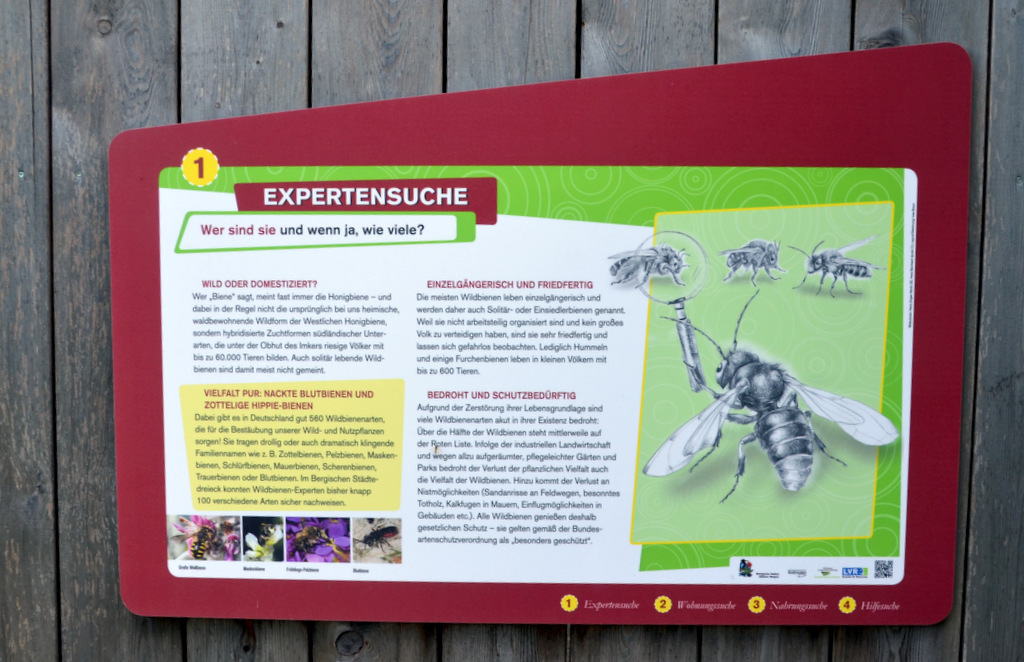 Der Botanische Garten wartete gleich mit mehreren Angeboten auf. Mit Dr. Jan Boomers von der Biologischen Station Mittlere Wupper ging es auf Entdeckertour zum Wildbienenlehrpfad. Unvorstellbar, wie viele verschiedene Wildbienenarten es gibt. So erfuhren die Zuhörer, dass die Honigbiene sehr breit aufgestellt ist und eine Fülle von Blüten zur Nahrung annimmt, im Gegensatz dazu aber andere Arten sich nur auf wenige oder gar nur eine einzige Blumenart festgelegt haben. Die Pelzbiene ist so groß wie eine Hummel, die Löcherbiene nur wenige Millimeter. Die Mauerbienen und Gehörnten Mauerbienen sieht man vorwiegend im April. In der Ohligser Heide stößt man häufig auf die Weidensandbiene. Zwischen den Pflanzen- und Bienenarten herrschen ganz enge Gemeinschaften.