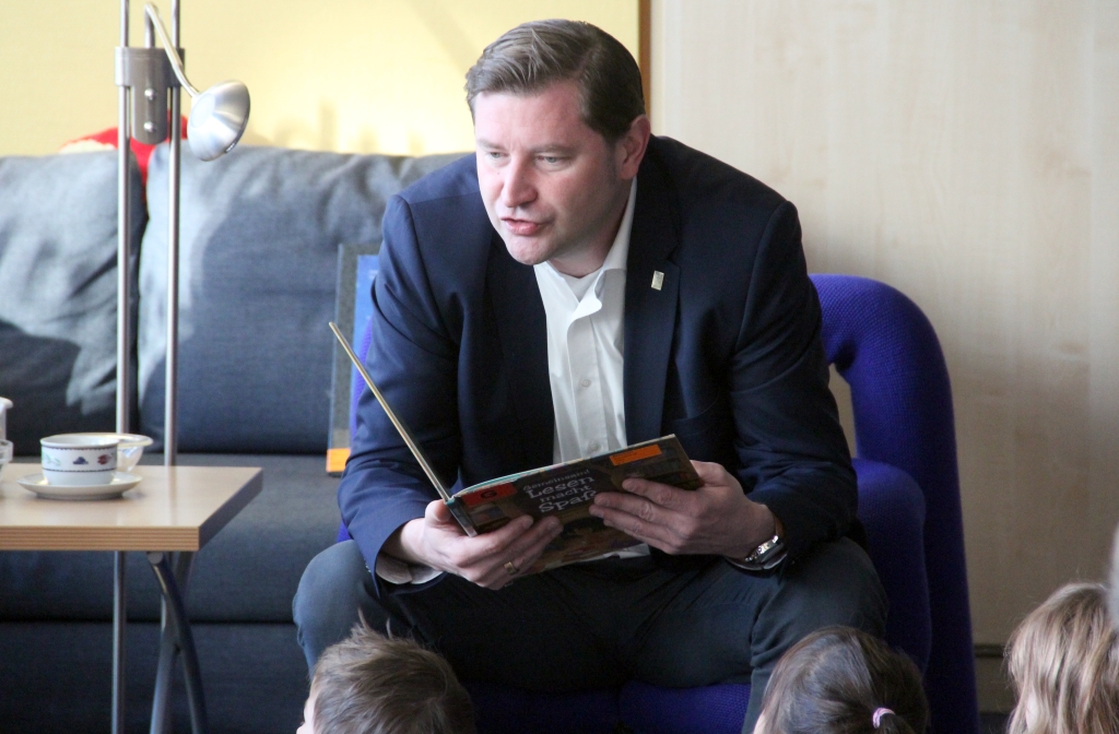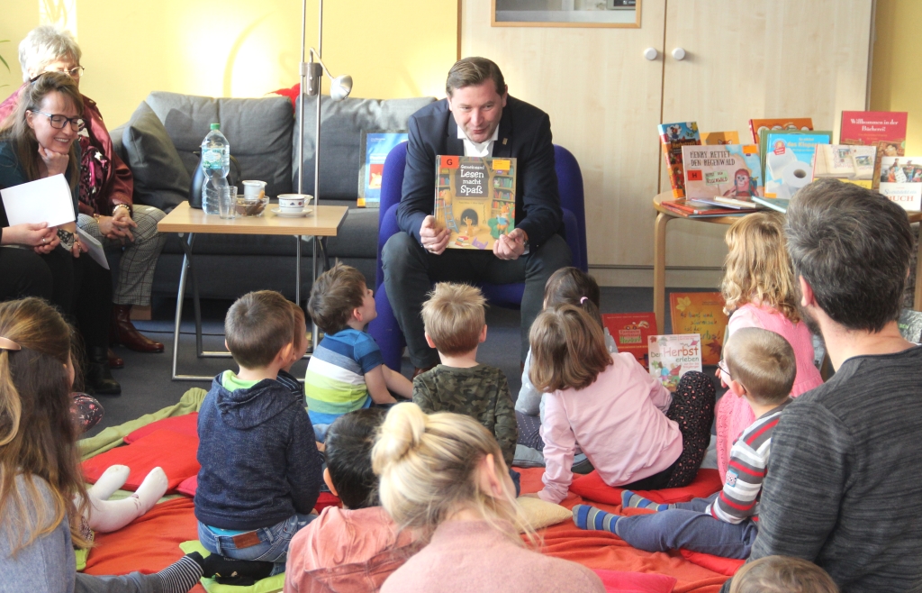Langeweile kam gestern auch nicht in der Stadtbibliothek auf. Denn auch dort wurde fleißig vorgelesen. Zeit für ein gutes Kinderbuch nahm sich hier Oberbürgermeister Tim Kurzbach. Mädchen und Jungs einer Gruppe der städtischen Kita „Klingenbande“ hörten interessiert zu. „An den unterschiedlichsten Orten werden von unterschiedlichsten Menschen die unterschiedlichsten Geschichten vorgelesen. In diesem Jahr ist das Thema, Natur und Umwelt´“, erklärte Bibliothekarin Charlotte Struckmeier.