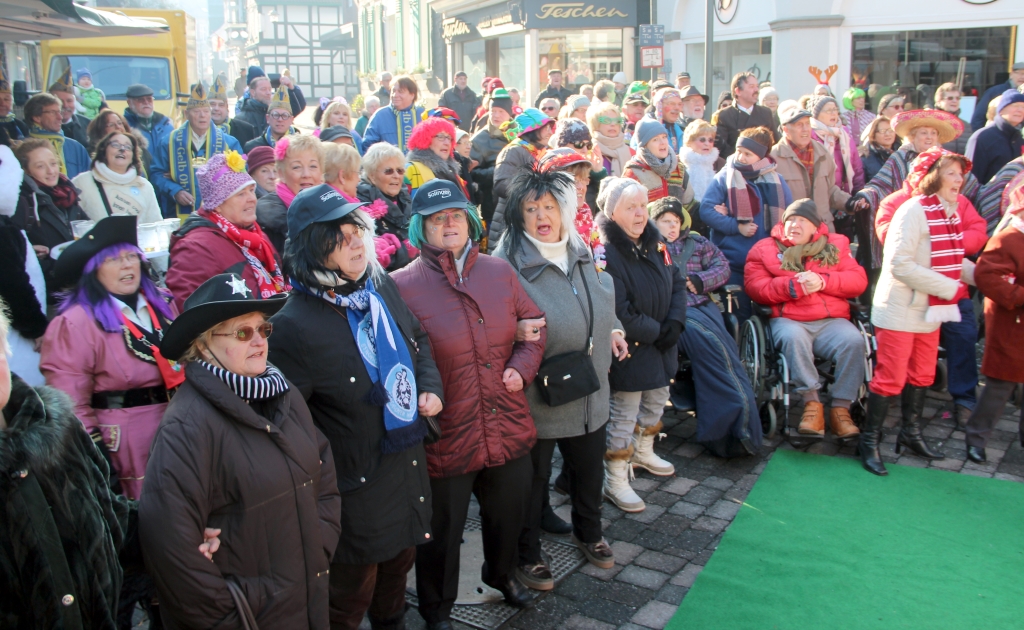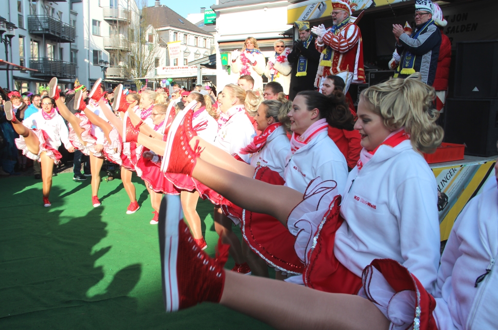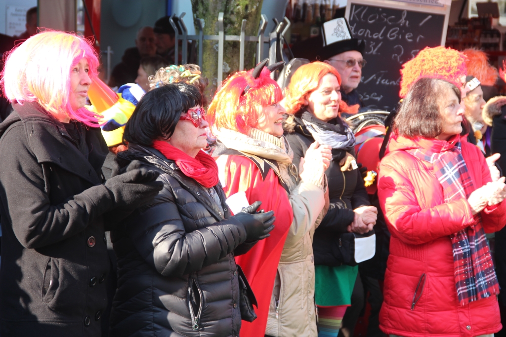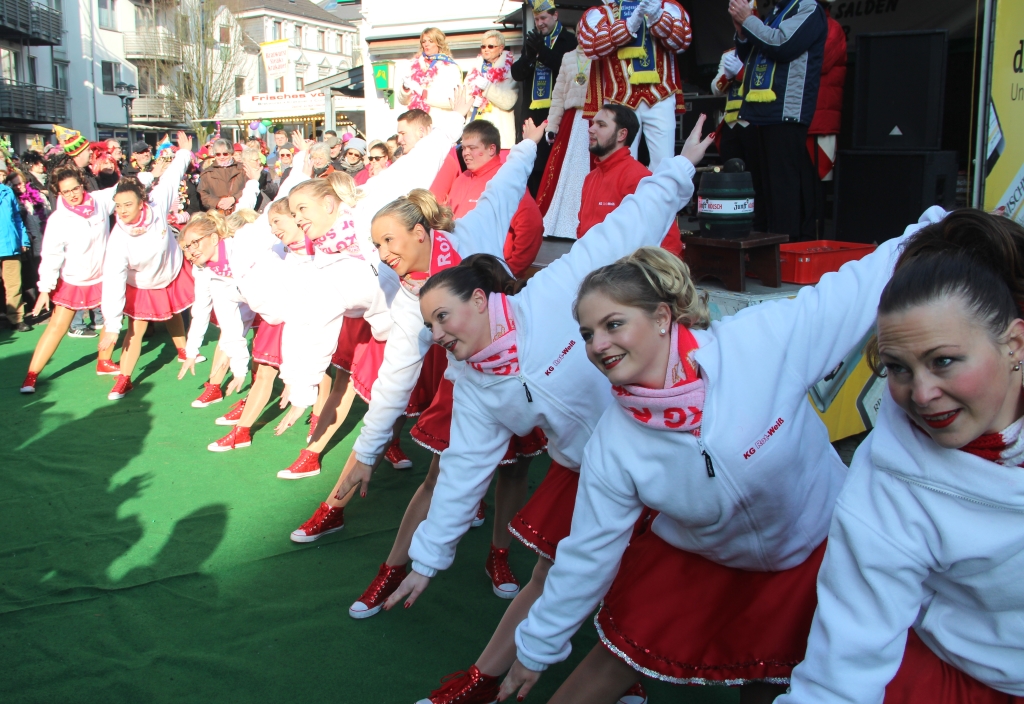 Und die Möhnen präsentierten sich lachend, feixend und vor allen Dingen höchst solidarisch mit ihrer Karnevalsprinzessin, als Daniela wissen wollte, ob man dem Herrn Prinzen denn auch etwas Rederecht einräumen sollte. Zwischen den Beiträgen auf der Bühne zeigten die Tänzerinnen und Tänzer des Tanzcorps der KG Rot-Weiß Klingenstädter ihr ganzes Können davor. Das karnevalistische Programm im Herzen Walds fand erst am späten Donnerstagnachmittag sein Ende.