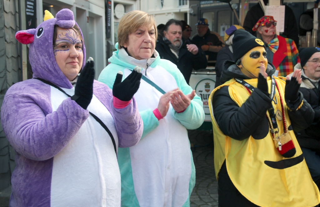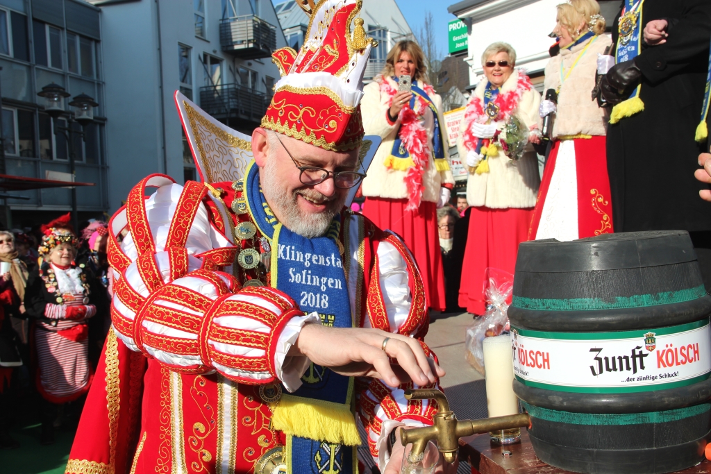 Diese waren zahlreich im Walder Rundling erschienen und trotzten den knackig-kalten Temperaturen schunkelnd, singend, mit einem Bierchen in der Hand und teils in einfallsreichen Kostümen. Karnevalsprinz Michael I. hatte heute kaum etwas zu melden, aber das Bierfass am Fuße der Bühne der Solinger Morgenpost dürfte er immerhin anzapfen. „Wir Mädels müssen doch zusammenhalten, oder?“, fragte seine Prinzessin (und Ehefrau) Daniela, das selbstverständlich rein rhetorisch in Richtung Publikum.