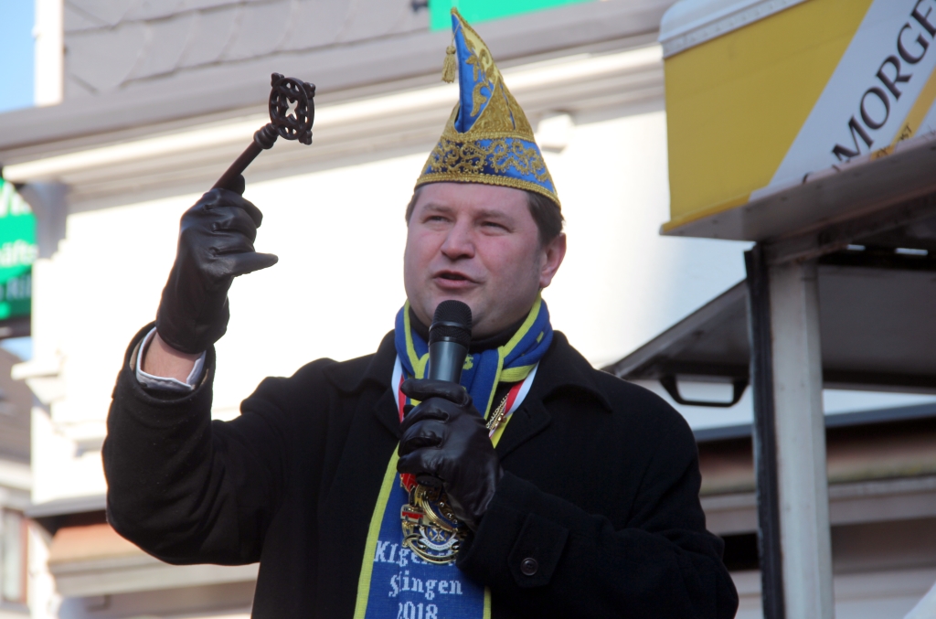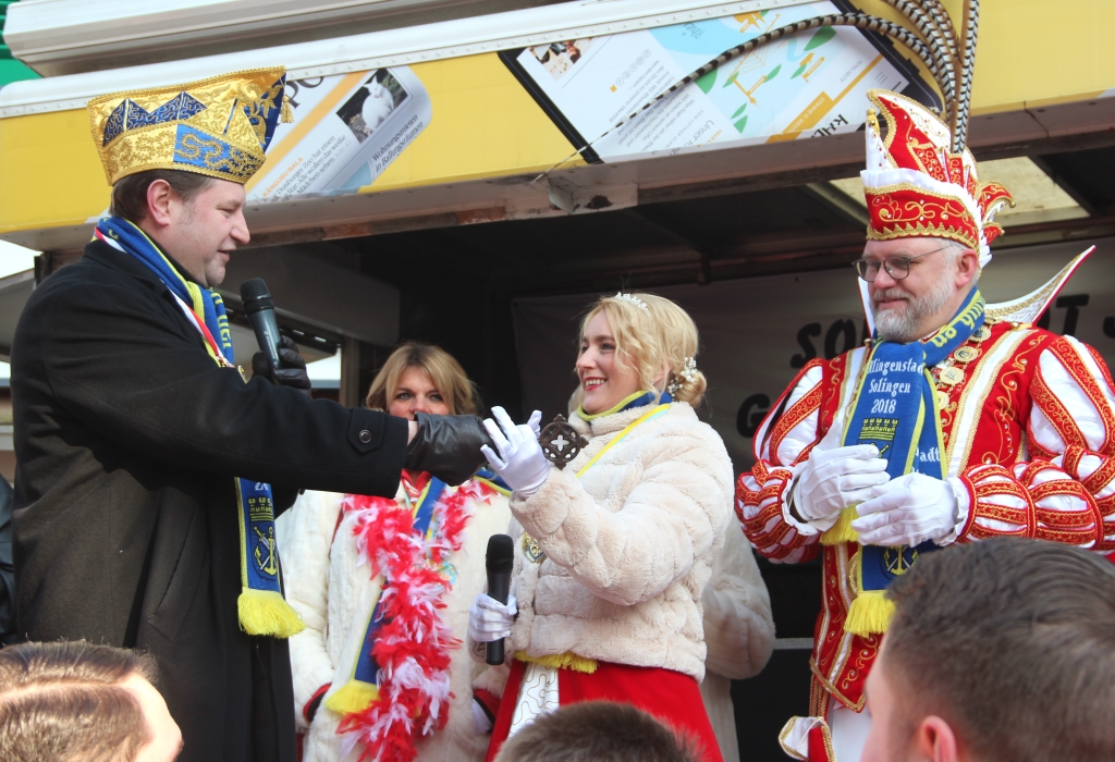 Zum Abschied gab es aber noch einen Präsentkorb und auch den Karnevalsorden des Oberbürgermeisters. Zu diesem Zeitpunkt war Tim Kurzbach freilich schon um den Schlüssel zum Rathaus erleichtert, denn um kurz nach 11.11 Uhr hat er diesen ganz in der Tradition der Weiberfastnacht an Solingens Karnevalsprinzessin Daniela I. übergeben. Denn ab jetzt „regieren“ die Möhnen.