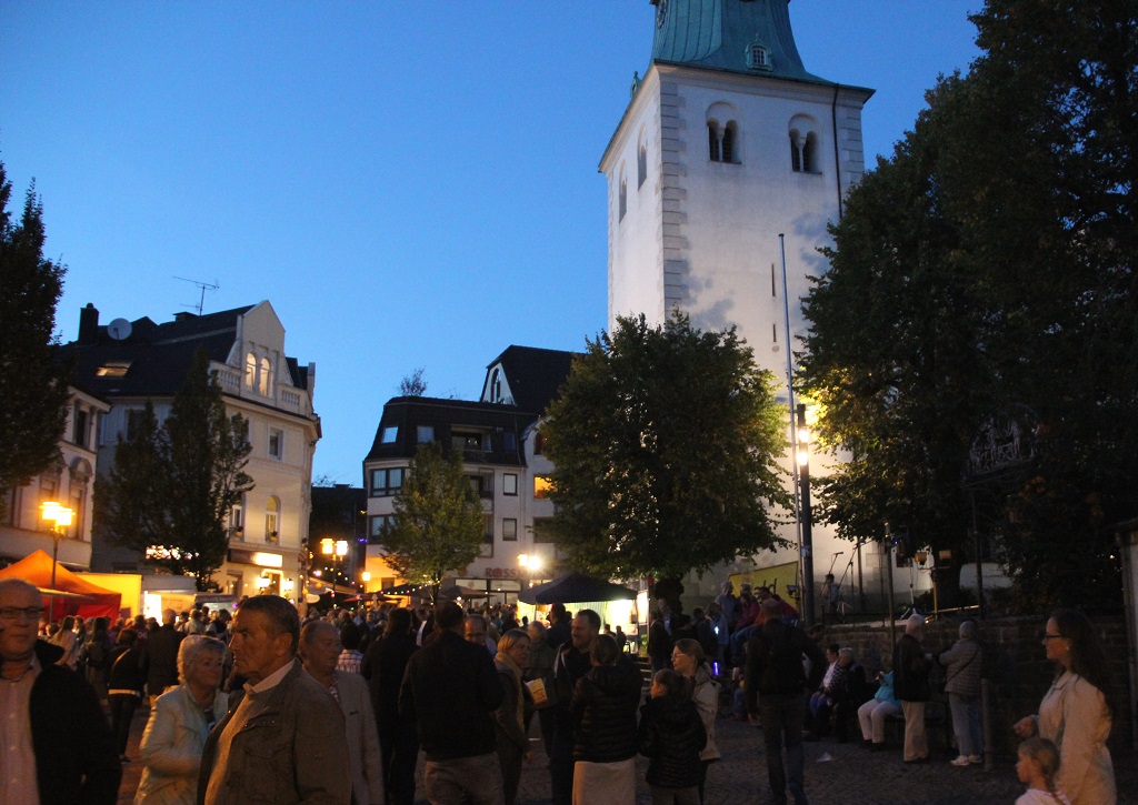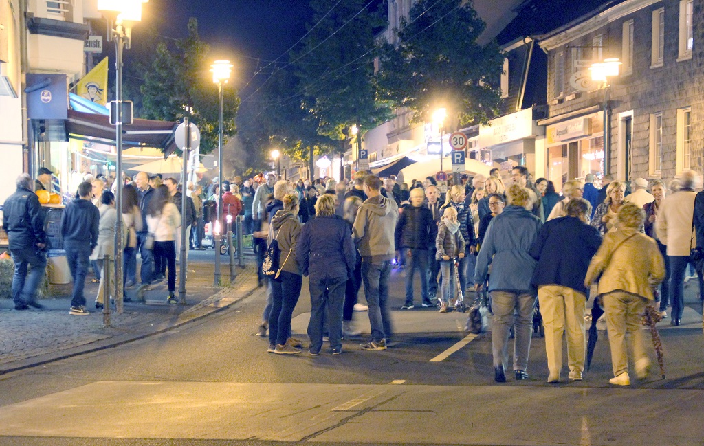 SOLINGEN (bgl) – Als Wald zu leuchten begann, war es am späten Freitagnachmittag sogar noch hell. Je dunkler es jedoch wurde, desto mehr Menschen strömten auf den Walder Kirchplatz. Und die kamen auch über die Friedrich-Ebert-Straße. Diese war gegen 20 Uhr bereits dermaßen gut besucht, dass sich die Veranstalter in Abstimmung mit der Polizei dazu entschlossen hatten, die Straße für die Fußgänger freizugeben. So wurde die Friedrich-Ebert- zwischen Post- und Schwindstraße am Freitagabend gesperrt und zur viel bevölkerten – und natürlich nur temporären – Fußgängerzone im Stadtteil.