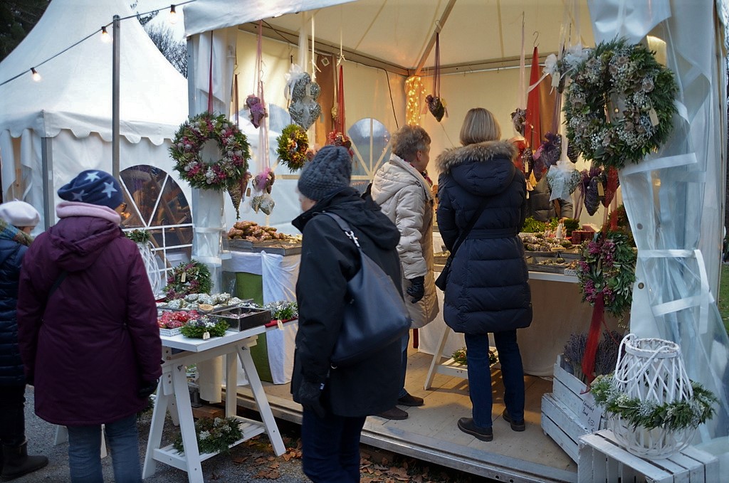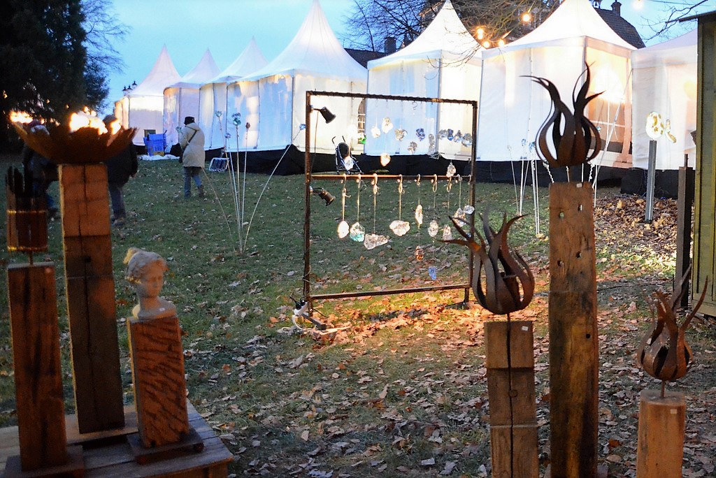Schon im 15. Jahr ist der Romantische Weihnachtsmarkt mit seinem Kunsthandwerk und mittelalterlichem Flair wieder ein Publikumsrenner. Über 100 Künstler, Kunsthandwerker und moderne Designer begeistern die Besucher mit einzigartigen und faszinierenden Angeboten. Außergewöhnliche Kunstgegenstände aus Glas, Skulpturen aus Holz und Keramik wechseln mit Mützen, Taschen oder Schmuck und Spielzeug. Die Kerzenwerkstatt zeigt ein großes Sortiment von selbst gegossenen oder gezogenen Kerzen in unglaublicher Vielfalt. Gabriele Nowak, ehrenamtliche Mitarbeiterin beim LVR Klinikum Düsseldorf freut sich über die gute Resonanz der Kunden. „Wir bieten wirklich außergewöhnliche Kerzen an, alles in Handarbeit erstellt.“ Die Tätigkeit dient in erster Linie dazu, Langzeitpatienten wieder für den ersten Arbeitsmarkt zu trainieren.