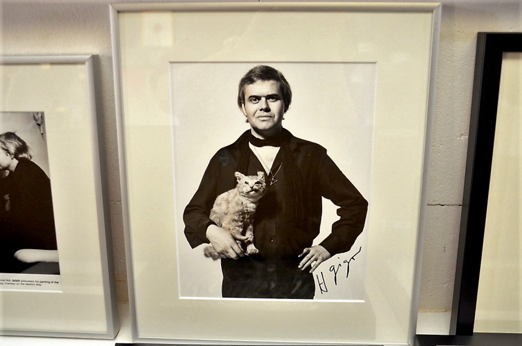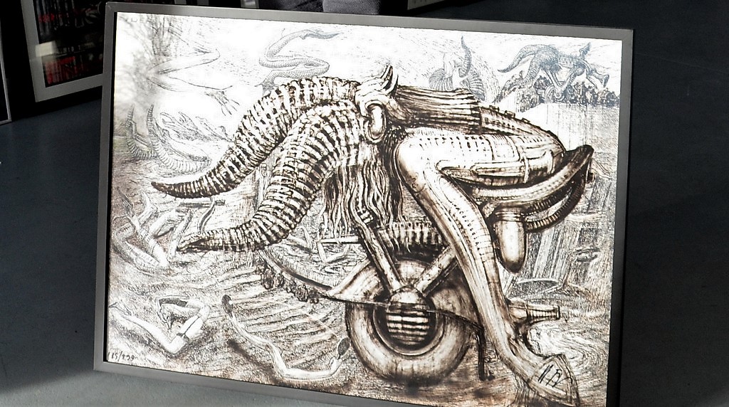 Der berühmte Alien-Designer HR Giger vereinte in seinen Objekten Mensch und Maschine auf unnachahmliche Weise und erschuf dadurch gothicartige und zugleich futuristische Hybriden der Dark Art. Der 1940 in Chur/Schweiz geborene geniale Maler, Skulpteur und Bühnenbildner kreierte in einer Verschmelzung von Surrealismus und düsteren Fantasien postapokalyptische Wesen, so den Biomechanoiden für den Film „Alien“ von Ridley Scott. 1980 erhielt Giger den Oscar für die besten Visual Effects. Mit Spritzpistole und Schablonen erschuf er surrealistische Traumlandschaften. Die Bandbreite seiner Werke umfasst Skulpturen, Plattencover, Interieur Design, Airbrush-Zeichnungen, Computerspiele und vieles mehr.