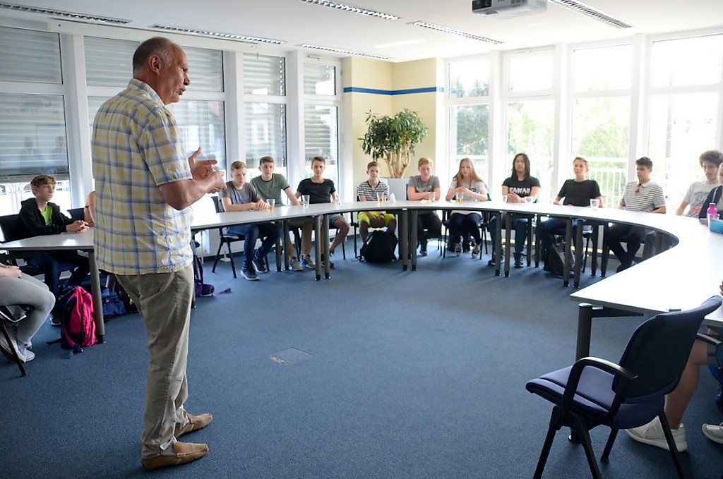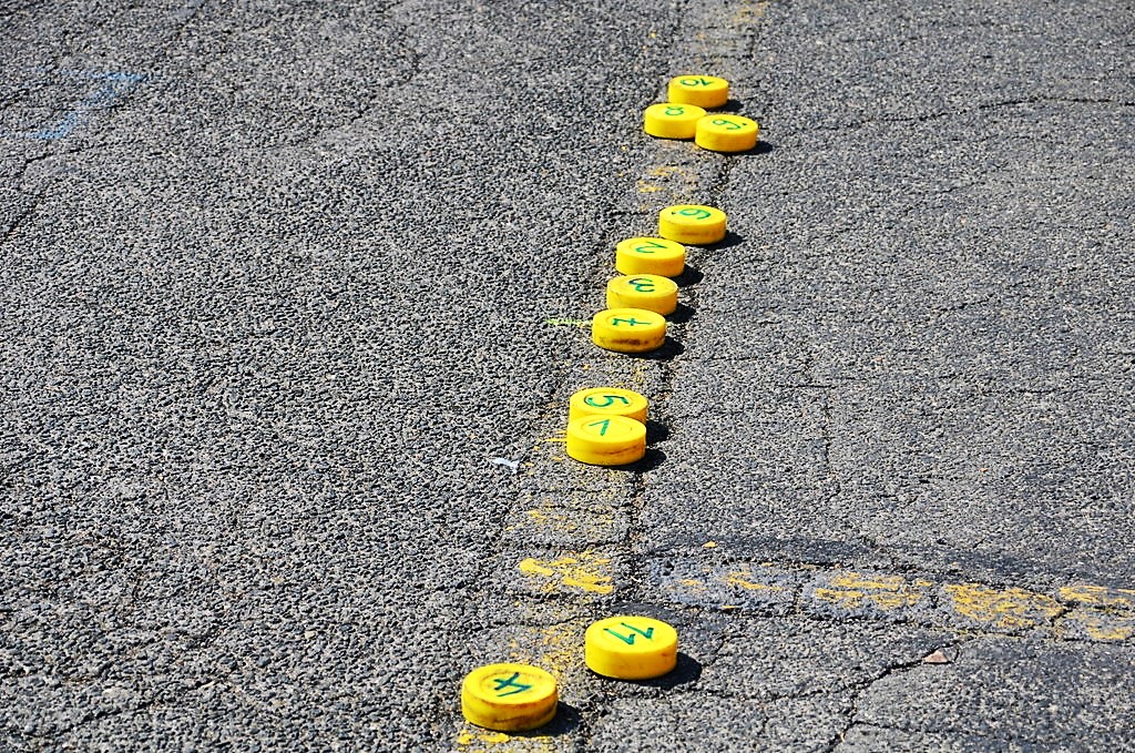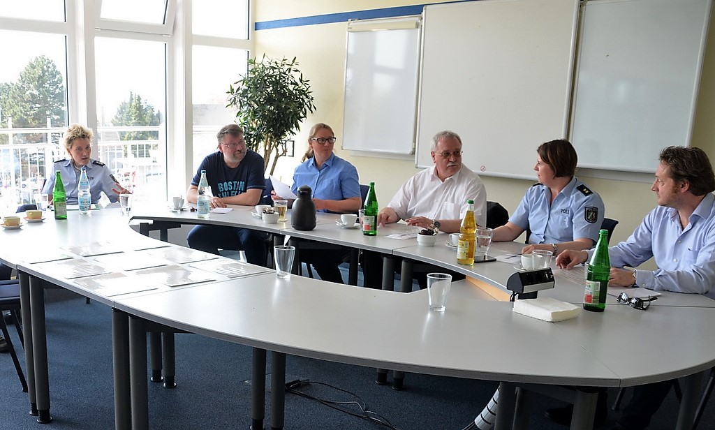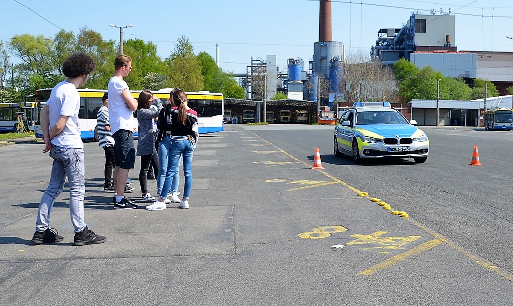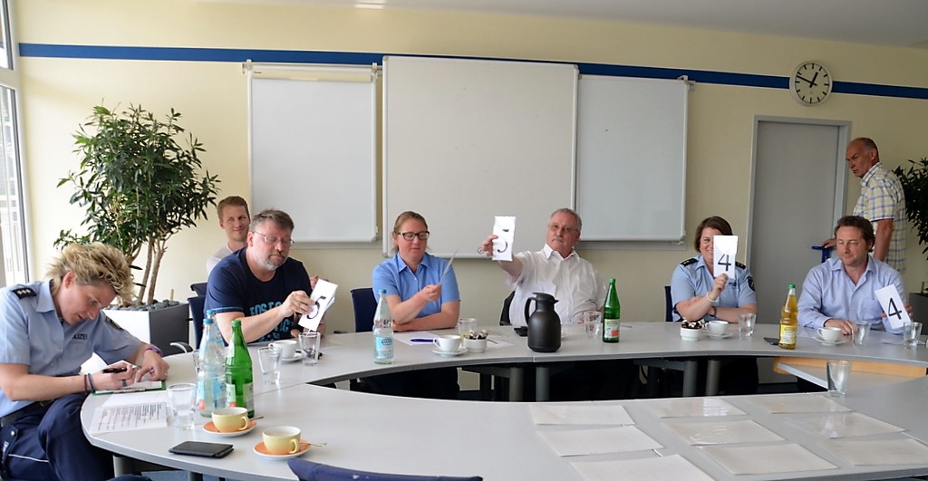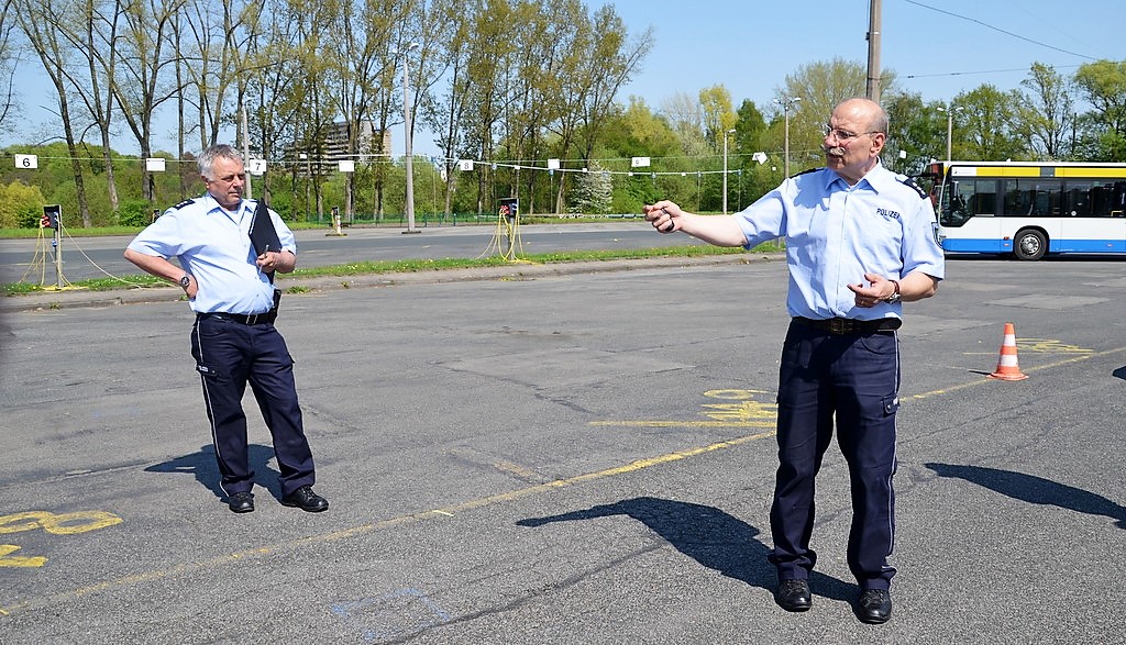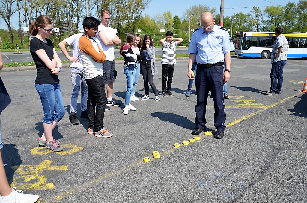 Auf dem Außengelände der Verkehrsbetriebe ist eine Übungssituation aufgebaut. Ein Streifenwagen steht in Warteposition. Schmidt erklärt: „Jeder Lotse bekommt einen Puck mit Nummer. Ich fahre gleich mit 30 km/h und werde exakt an den Pylonen eine Gefahrenbremsung einleiten. Dabei muss der Bremsweg so kurz wie möglich sein. Ihr platziert eure Pucks da, wo eurer Meinung nach der Wagen zum Stehen kommt.“ Dann setzt sich der Polizist hinters Steuer und fährt los. Die gewählten Puckpositionen sind vertretbar. Beim zweiten Durchgang erhöht Schmidt seine Geschwindigkeit auf 60 km/h. Dieses Mal haben sich alle verschätzt. „Doppelte Geschwindigkeit heißt vierfacher Bremsweg“, betont Ulrich Schmidt. Die Demonstration hinterlässt deutlich Eindruck.