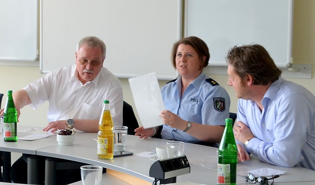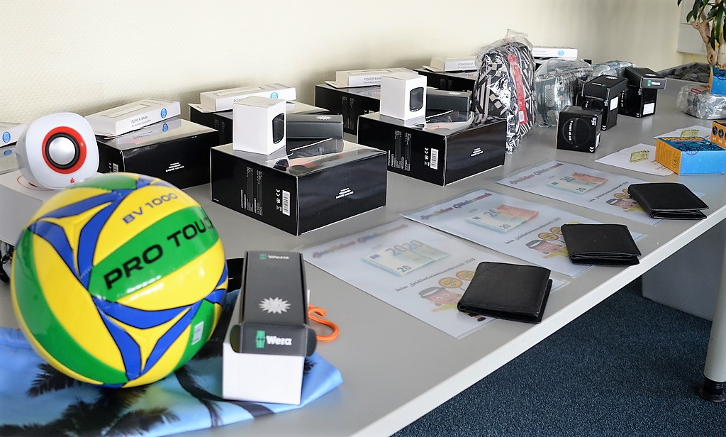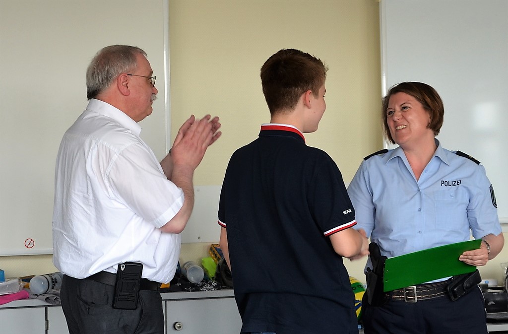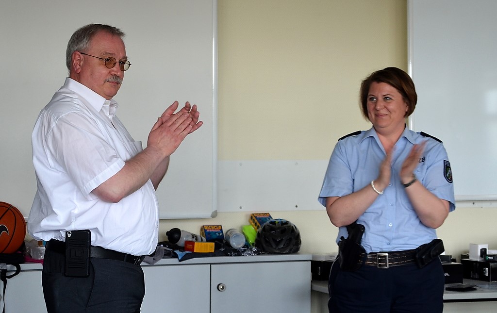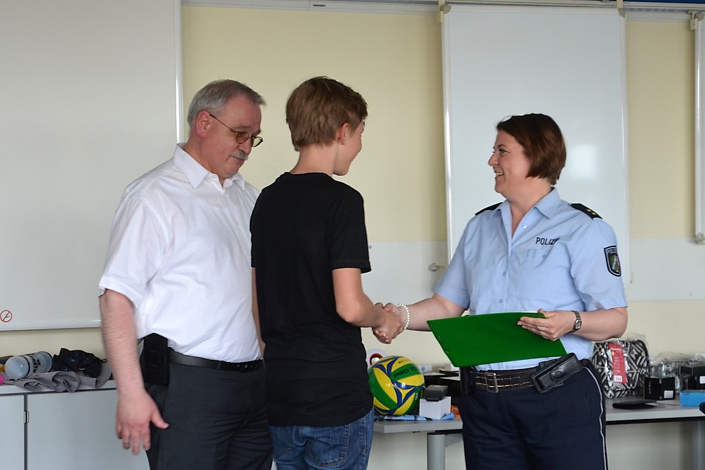 Polizeioberrätin Tanja Veljovic und Bezirksbürgermeister Richard Schmidt übernehmen die Siegerehrung. Die Preise sind von Solinger Firmen gestiftet. Da gibt es zahlreiche Gutscheine, Bälle, Fahrradhelme und mehr.