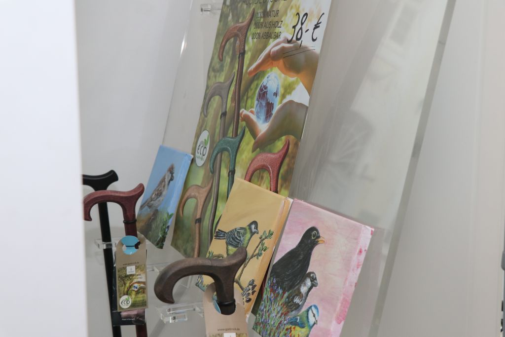 Mit der Wuppersteine-Kunst möchte das Sanitätshaus Köppchen einerseits auf die Wuppersteine aufmerksam machen, andererseits natürlich auch die Blicke der Kunden auf die ausgestellte Ware lenken. So wurde – passend zu den Wuppersteinen – der Fokus auf „Outdoor-Waren“ gelegt. „Kompressionsstrümpfe, mit denen man wandern kann“, zählt Miriam Gatawetzki-Köppchen auf. „Aber auch das entsprechende Schuhwerk, in das die maßgefertigten Einlagen aus unserer Werkstatt reinpassen.“