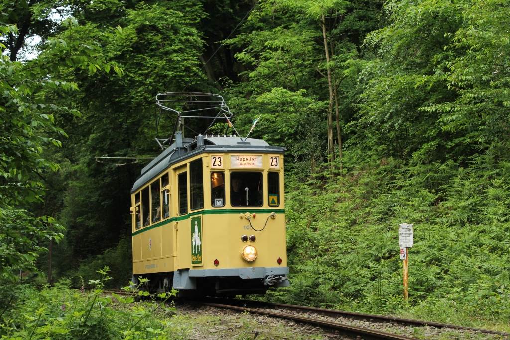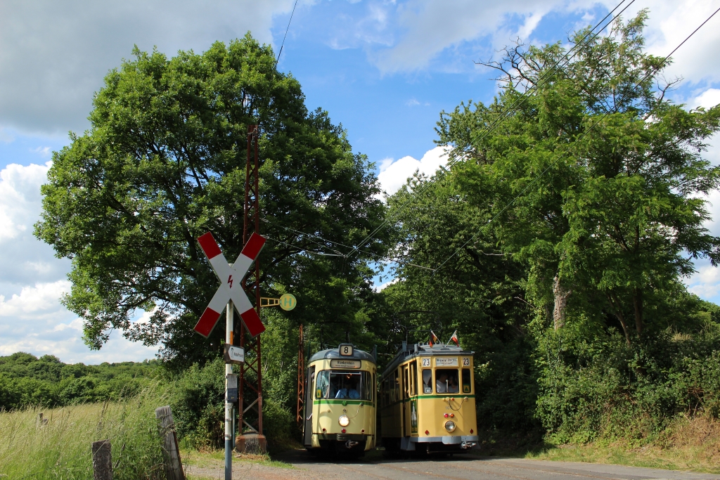 Von Solingen aus ist das Straßenbahnmuseum der Bergischen Museumsbahnen nur den sprichwörtlichen Katzensprung entfernt. Direkt am Café Hubraum führt die Kohlfurther Brücke über die Wupper – und ohne Umwege zum Museum. Unzählige Interessierte fanden am langen Pfingstwochenende den Weg zur Solinger Stadtgrenze und sorgten bei wechselhaftem Wetter für bestens besuchte Fahrten anlässlich des 25. Pfingsfestes. Diese fanden an den beiden Veranstaltungstagen im Halbstundentakt satt.