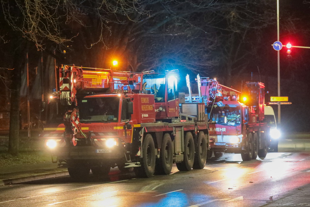 Aufgrund eines technischen Defektes in Wuppertal musste der Solinger Feuerwehrkran am Donnerstagabend von seinem Wuppertaler Gegenstück abgeschleppt werden. (Foto: © Tim Oelbermann)