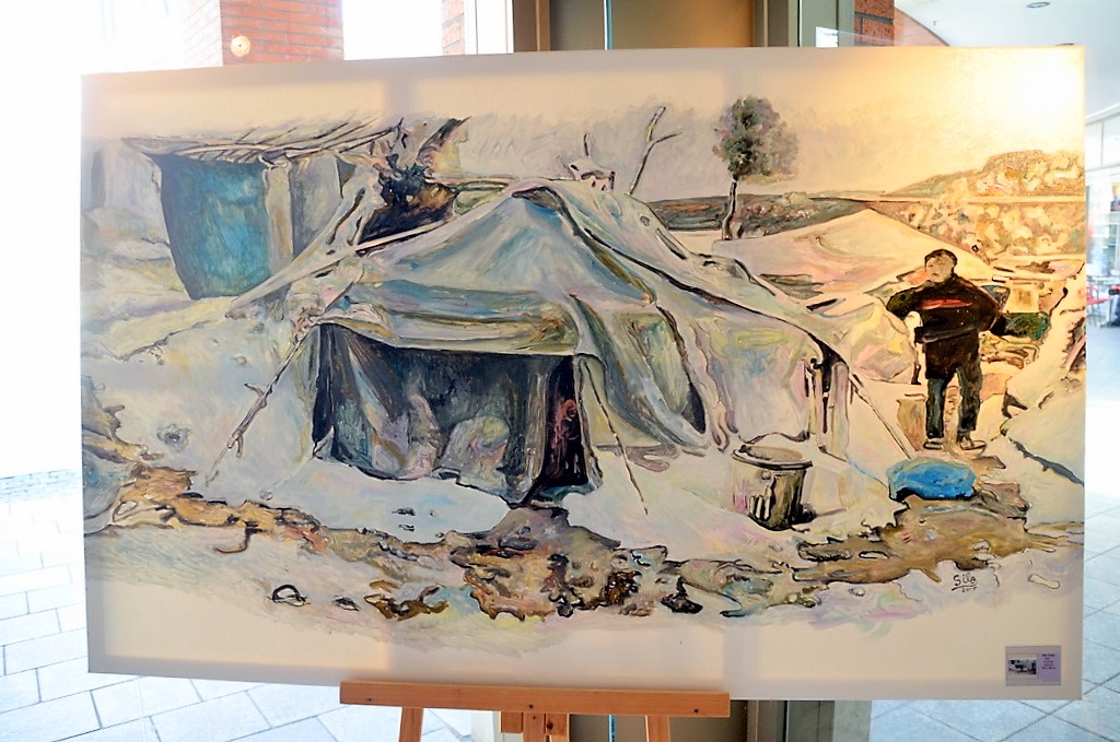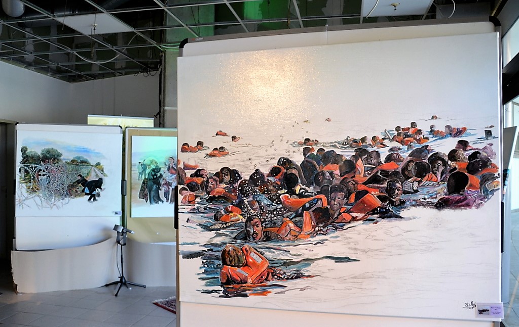 Der aus Syrien stammende Künstler Yahia Alselo (*1966) zeigt im Erdgeschoss der Clemens-Galerien (city art-Galerie E1) großformatige Bilder von Flucht und Migration. Auf den Gesichtern der Menschen spiegeln sich Furcht und Elend wider. „Seine Bilder sind plakativ und unglaublich berührend“, stellt Timm Kronenberg vom city-art-project fest.