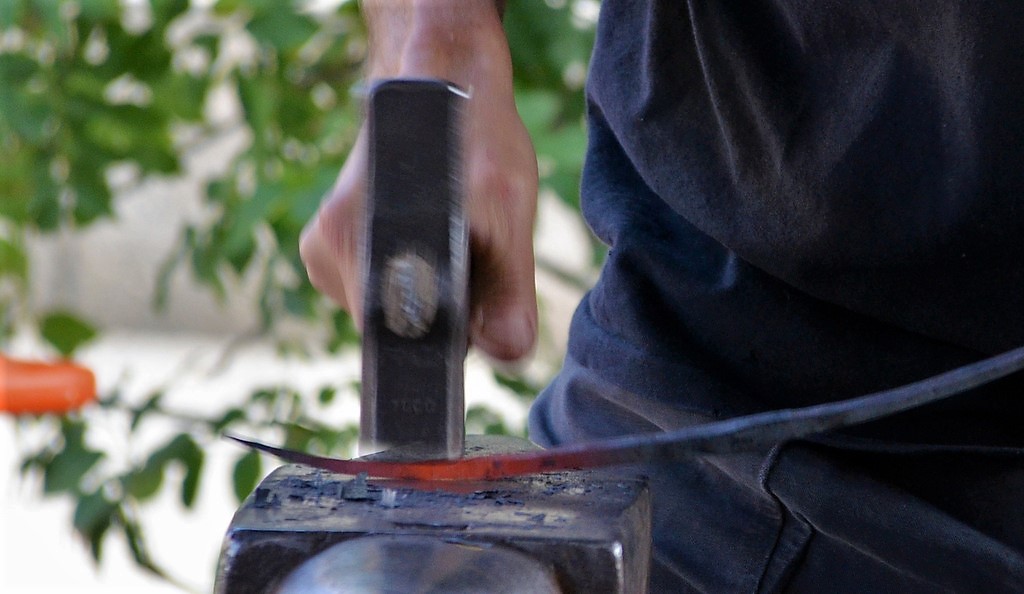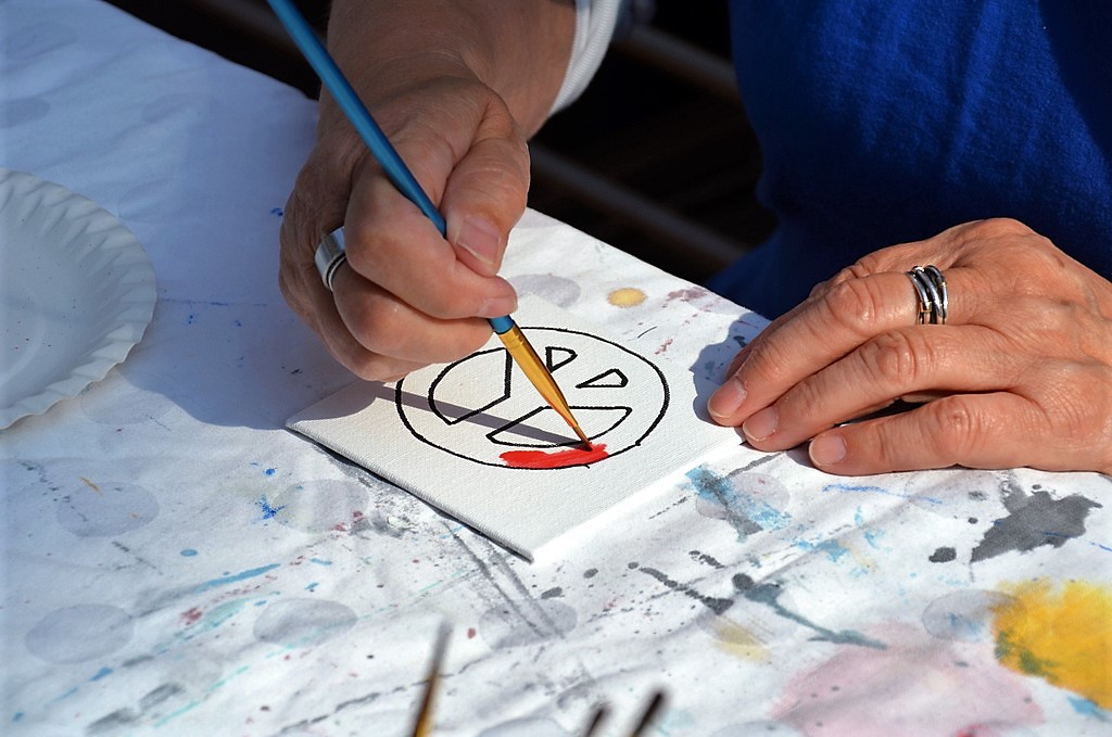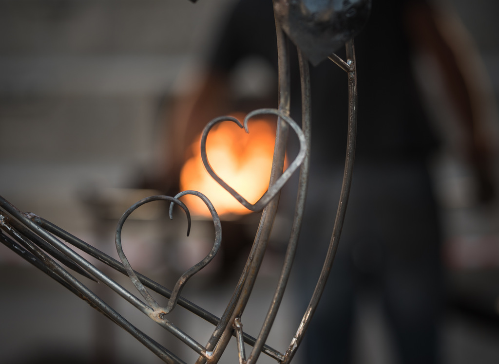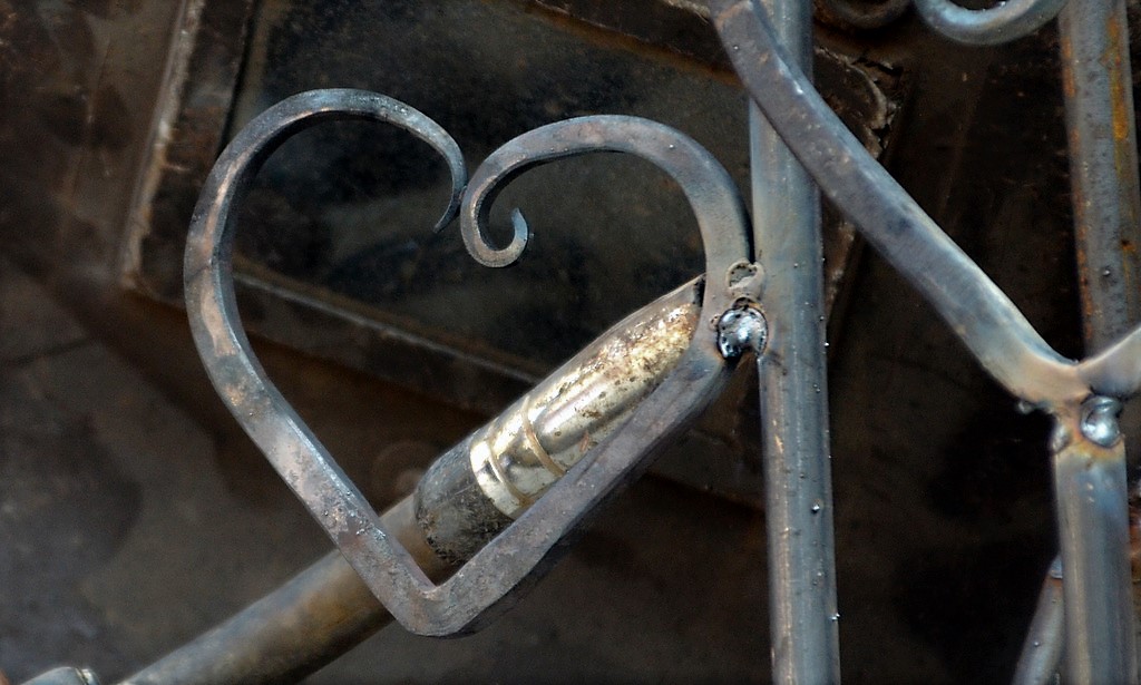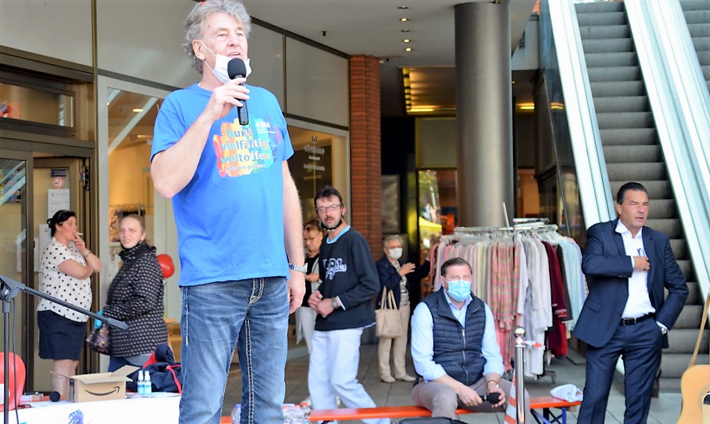 Ununterbrochen erklang das Geräusch eines Schmiedehammers. Kunstschmied Michael Bauer-Brandes war mit seinem Team ständig im Einsatz. Immer wieder wollten Besucher Herzchen schmieden und an dem großen Peace-Zeichen aus Eisen befestigen. Das hatte Bauer-Brandes schon im Vorfeld in seiner Werkstatt angefertigt. „Es soll ja eine Mitmach-Aktion sein“, erläuterte der Kunstschmied. „Da muss man überlegen, welche Möglichkeiten es für die Besucher gibt. Für „Zeig dein Herz für Frieden und Demokratie „ sollte es ein Gegenstand mit Symbolkraft sein. Was liegt da näher als ein Herz?“ Die Wahl war offensichtlich genau richtig. Denn ein Herz nach dem anderen fand sich am Peace-Zeichen wieder. Fünf Herzen hatte Michael Bauer-Brandes bereits selbst geschmiedet. Damit wollte er ein Statement für die kürzlich getöteten Kinder abgeben (wir berichteten). Das Kunstwerk wird wohl einen vorläufigen Platz in einer der Galerien bekommen.