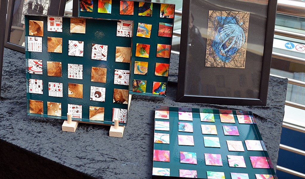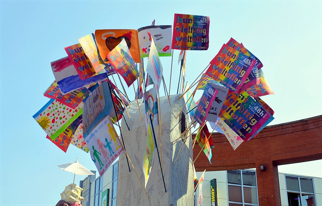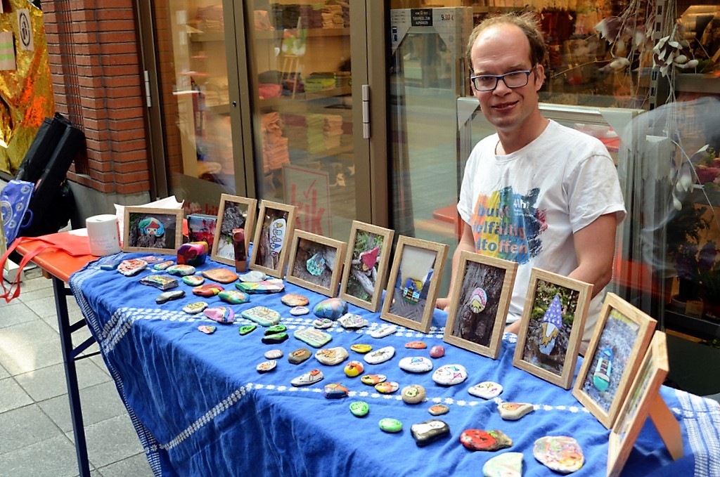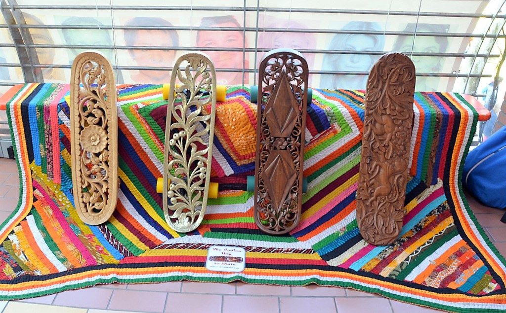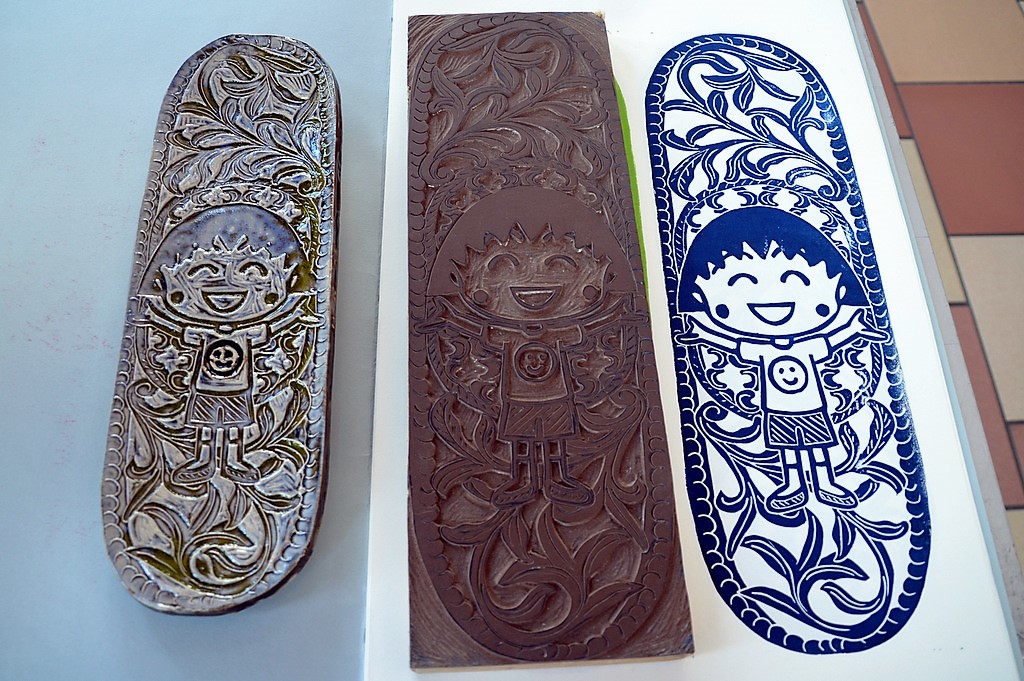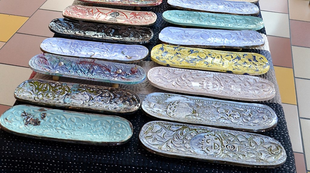 Bei Tobias Megerle drehte sich alles um das Skateboard. Seit 2012 befasst sich der Lehrer für Kunst und Sozialwissenschaft mit diesem Objekt. Damals war er als Kurator in Bombay tätig und arbeitete mit 12 Holzschnitzern an einem gemeinsamen Projekt. Hier in Deutschland hat er das Projekt erneut aufgegriffen. Aus Zeichnungen wurden Linolschnitte erstellt und diese dann für die Tonmodelle verwendet. Die fertigen Arbeiten sehen nach dem Glasieren beinahe aus wie Reliefs. Jedes Stück ist ein Unikat. Seit August ist Megerle an der Alexander-Coppel-Gesamtschule tätig. Hier hatte er mit Schülern der 5. und 6. Klasse im Kunstunterricht passend zum 48 h–Motto entsprechende Designs entworfen, aus denen eine große Collage in Form eines Peace-Zeichens entstanden ist. Hier ging es darum, was man mit Skateboards assoziiert, wie Coolness, Freiheit und Jugendkultur.