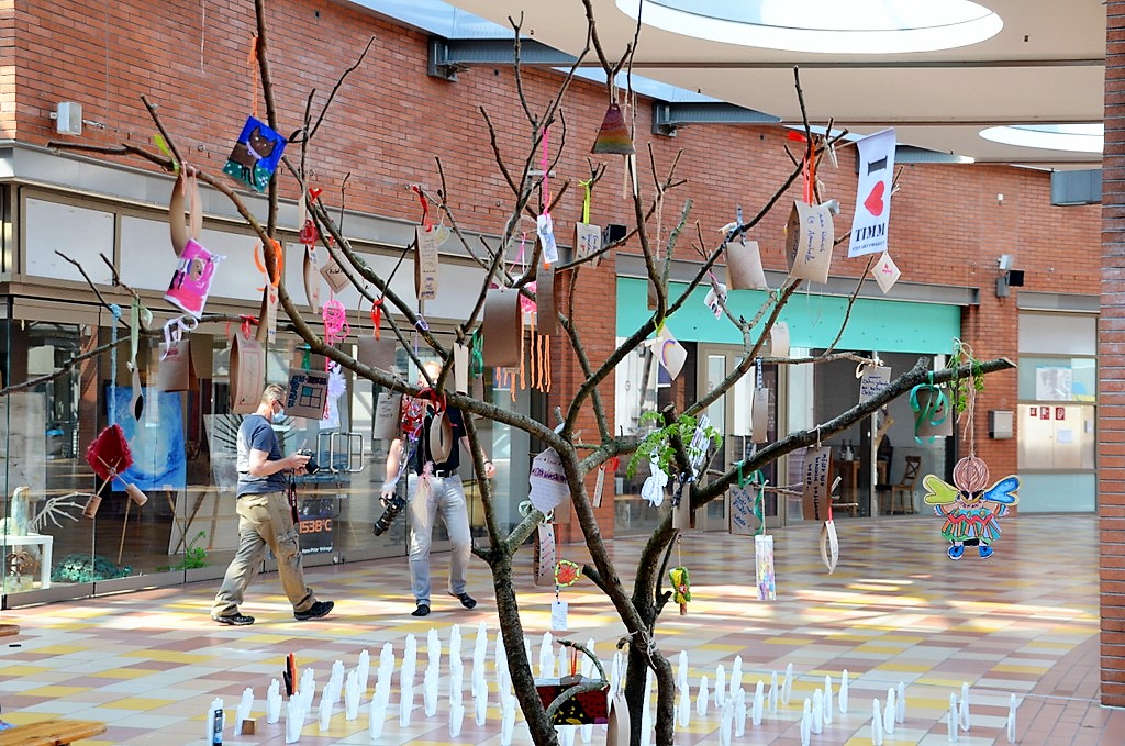 Auch Stefan Seegers „Wunsch-Baum für Freiheit“ sprühte mittlerweile vor guten Wünschen. Bunte Zettel hingen neben kleinen Figuren. Selbstgebasteltes und Selbstgemaltes verwandelten kahle Zweige in ein Wunschmeer.