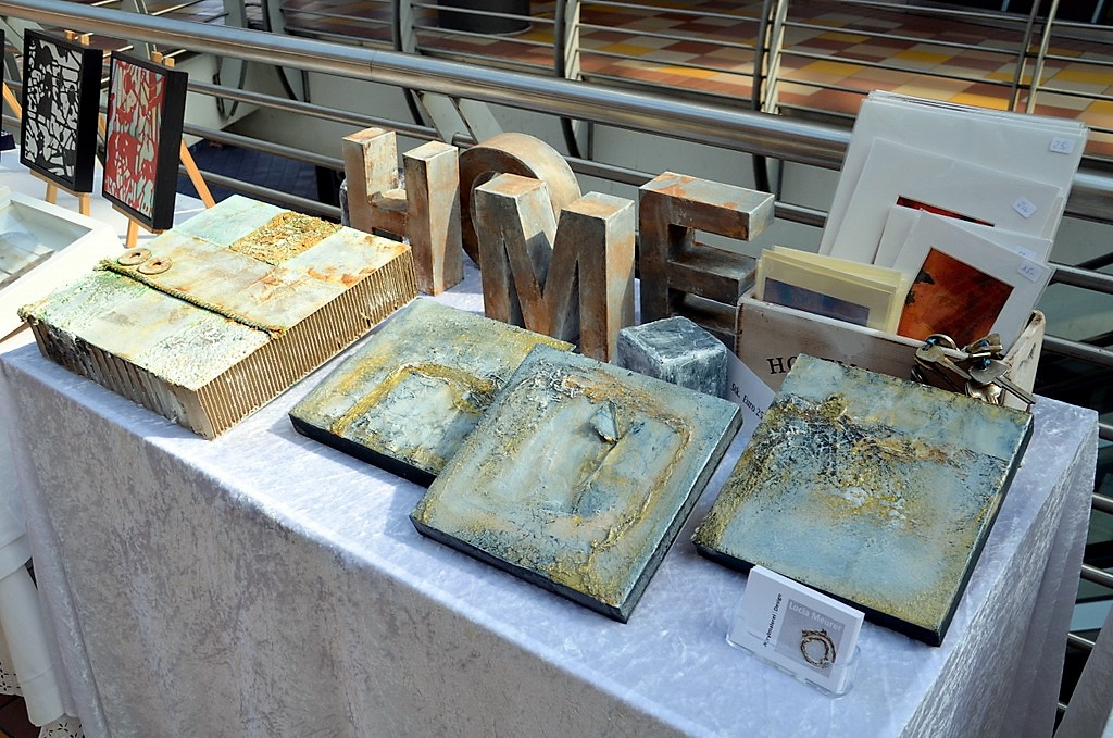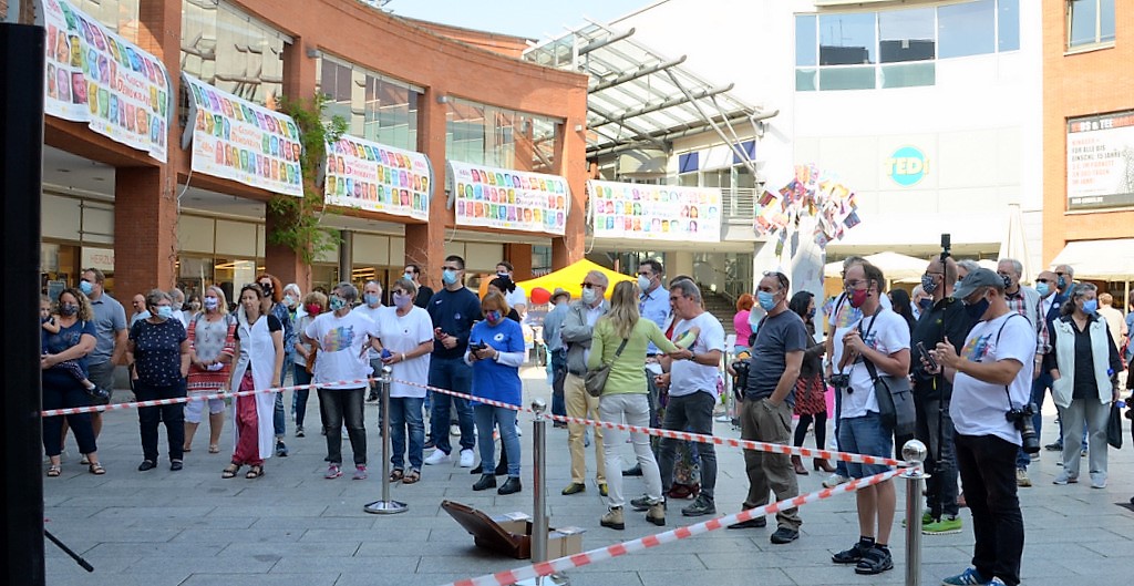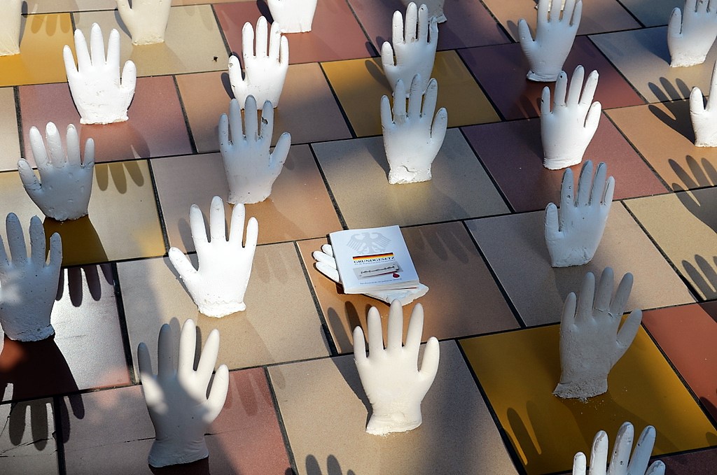 Im Obergeschoss präsentierte Künstler Ralf Buchholz von NEANDERARTgroup seine Aktion „Hands up. 70 Hände aus Beton umrahmten das Grundgesetz. Im Vordergrund leuchtete eine Hand in den Farben der Deutschlandfahne. „Das Grundgesetz gibt es jetzt seit 70 Jahren“, erklärte Buchholz. Die Hände sind weiß gekälkt und leicht porös gegossen. „Das zeigt, wie bröckelig manchmal unsere Demokratie ist“, so Buchholz. Mit dieser Installation hatte der Künstler an diesem Wochenende Premiere. Die Hände bieten vielfältige Interpretationsmöglichkeiten: Meinungsäußerung, Hilferuf, Abstimmung.