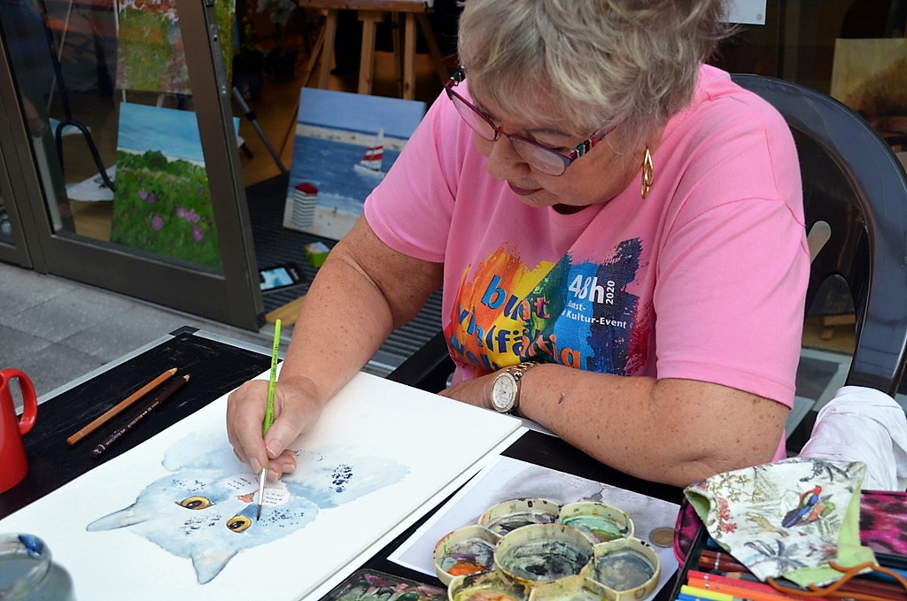 Obendrein stellte Kristina Eckel erstmals ihre Künstlerporträts in voller Anzahl aus. Für ein Konterfei braucht Eckel etwa acht Stunden. Sie hatte sich zum Ziel gesetzt, alle Künstler der Galerien zu porträtieren (wir berichteten). Und es hatte geklappt. Pünktlich zum Event standen alle 44 Künstler Seite an Seite vereint. Die Künstlerkollegen waren einfach begeistert und sparten nicht mit Lob für die großartige Porträtmalerin.