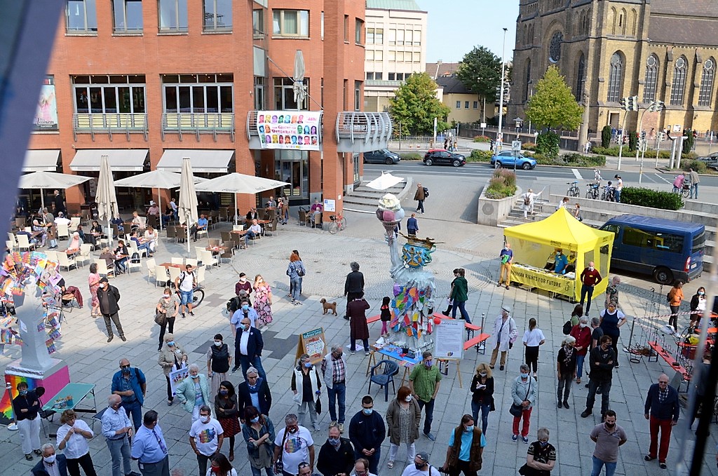 Auch die über 5 Meter hohe Statue der Freiheit von Lothar Ruthmann glich mittlerweile einem Farbenmeer. Unzählige Besucher hatten sich bereits auf einem freien Feld mit Pinsel und Farbe verewigt. Das riesige Eishörnchen fiel schon von weitem ins Auge. „Die Statue steht als Symbol des Friedens“, beschrieb der Künstler sein Werk. „Der weiße Schirm verkörpert Reinheit und Unschuld. Er schützt das empfindliche Sahnehäubchen des Friedens, das so schnell vergänglich ist. Die verschiedenen Hautfarben der Völker dieser Erde sind als Eiskugeln in den entsprechenden Farben dargestellt, umhüllt von dem Hörnchen als Zusammenhalt. Die steinähnliche Oberflächenstruktur der Skulptur demonstriert die Härte der Demokratie.“ Fast schon eine philosophische Betrachtung. Möglicherweise findet „Miss Liberty“ demnächst im Rathaus ihr neues Zuhause.