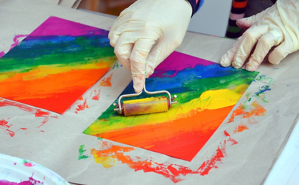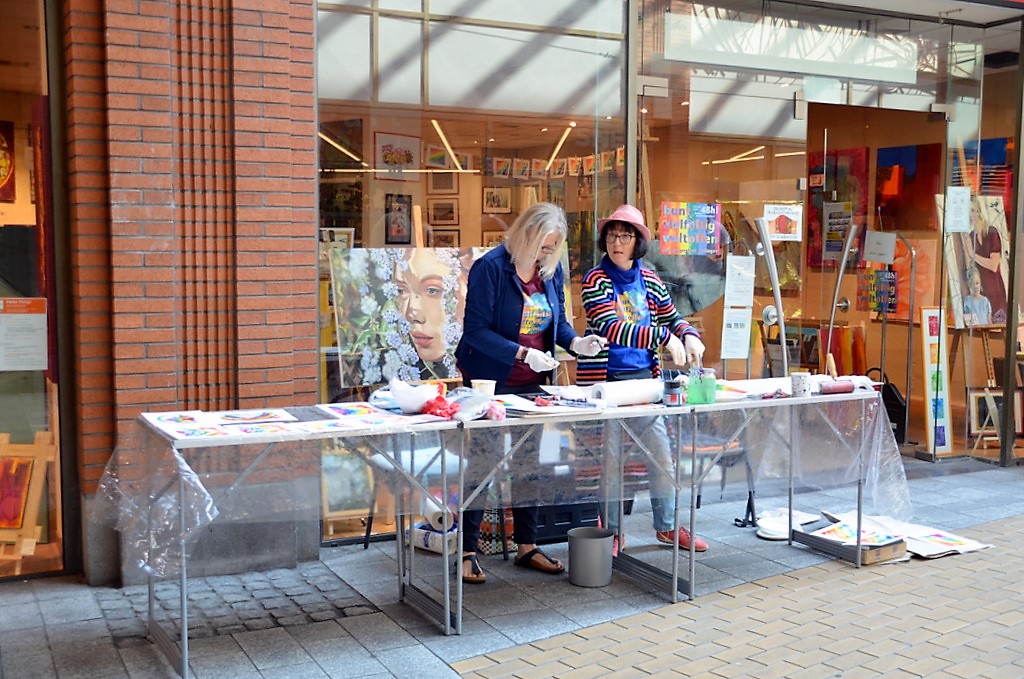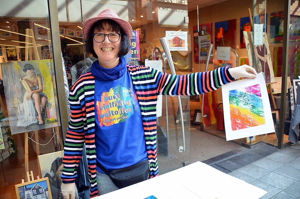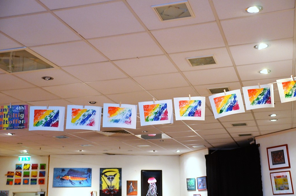 Heike Ponge und Kristina Eckel zauberten Regenbogen auf Papier. Jeder Regenbogendruck war zum Preis von 10 Euro erhältlich. Die Hälfte des Erlöses geht an das Diakonische Werk Solingen und ist bestimmt für die Flüchtlingshilfe auf Lesbos. Der Regenbogen steht als Symbol der Hoffnung und Vielfalt – er enthält alle Farben. Die fertigen Drucke hingen aufgereiht fast wie ein Banner unter der Decke der Galerie.