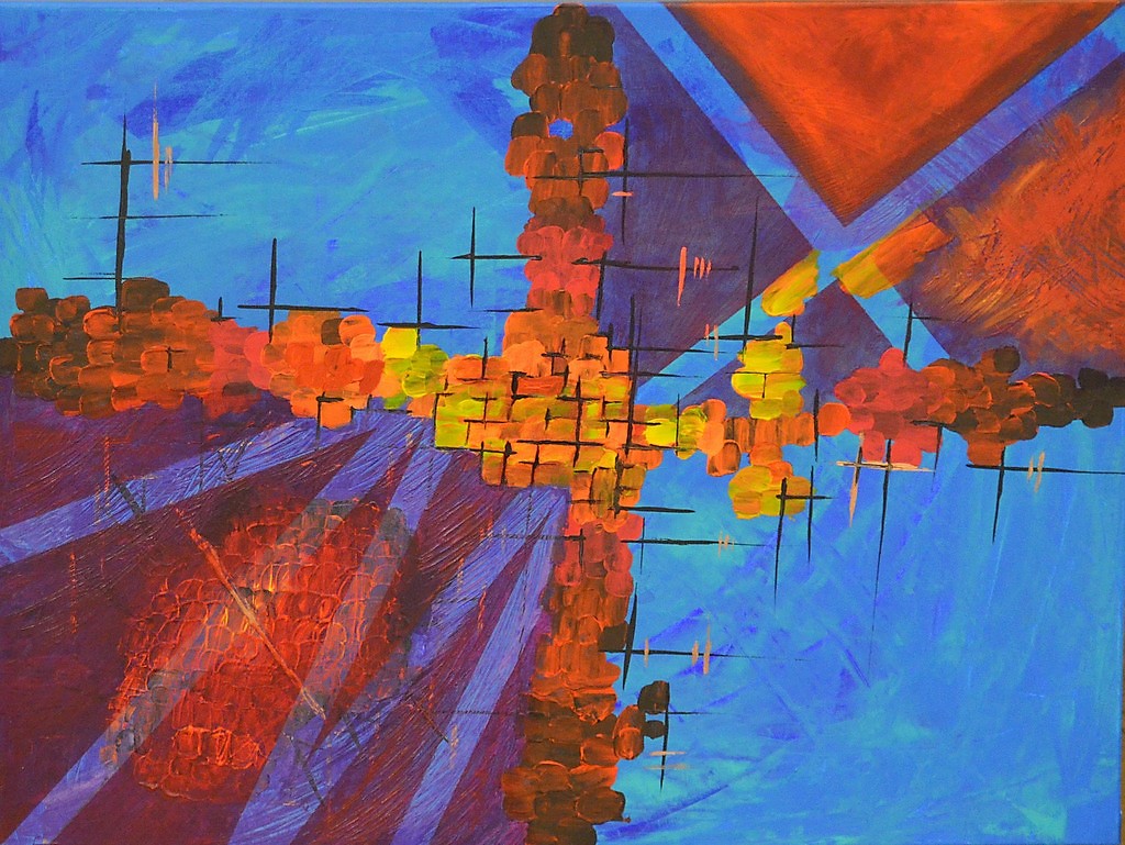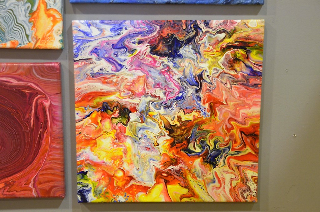 Auf Formate hat sich Holtwick nicht festgelegt. Von 15 x 15 cm bis 60 x 80 cm, mal quadratisch, mal rechteckig, hängen Arbeiten an der Wand der Galerie. Daheim hat er sogar eine 100 x 120 cm große Leinwand in Arbeit. „Je größer der Keilrahmen, desto größer die Herausforderung“, beschreibt er die Schwierigkeit. „Die Farbe wird ja aufgegossen und dann das Bild nach allen Seiten geschwenkt.“ Die Werke sind aus reiner Acrylfarbe entstanden und später noch mit Firnis überzogen worden, wodurch die Farben an Intensität gewinnen.